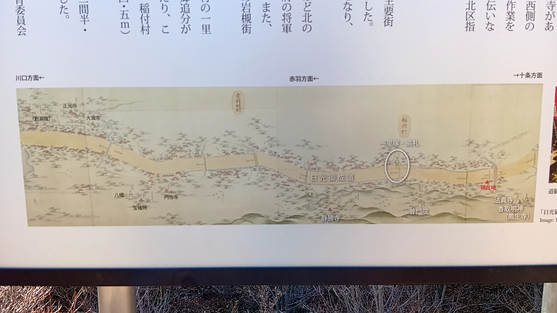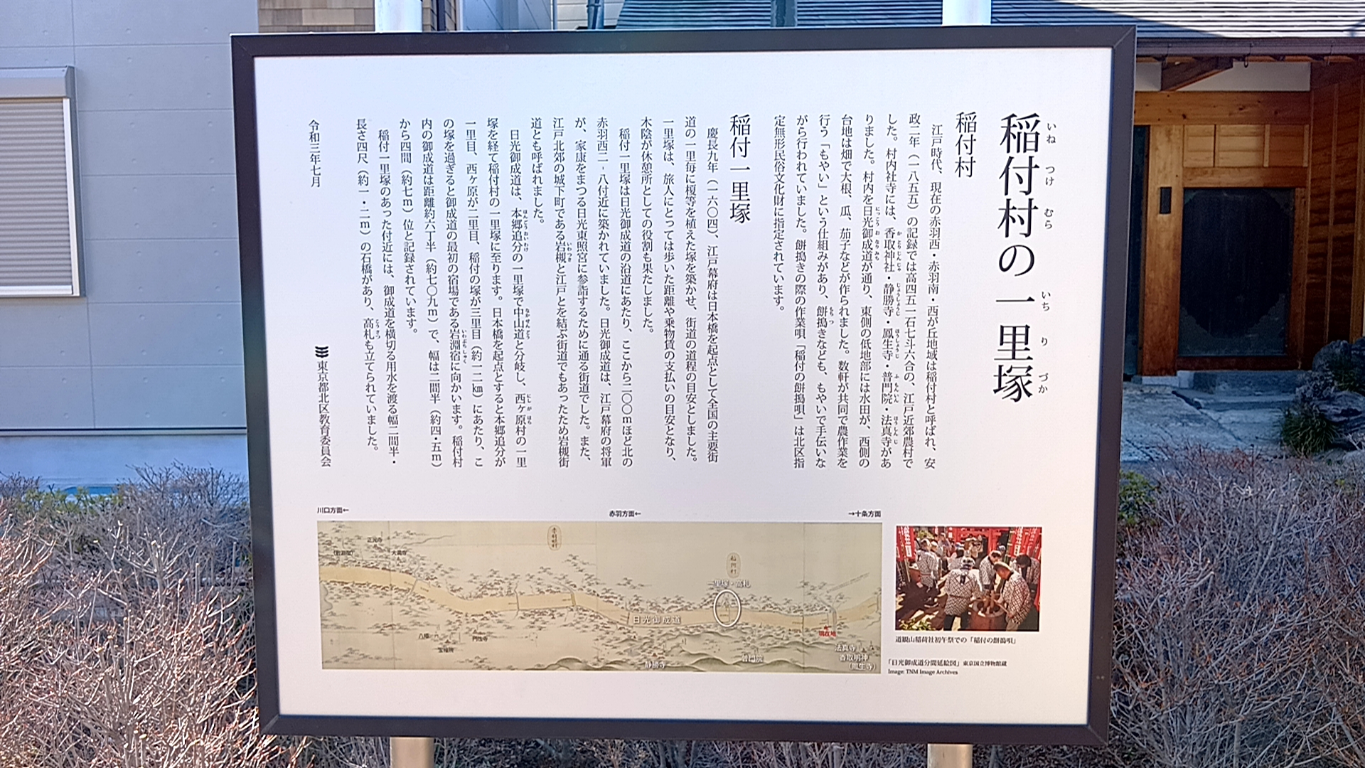 日光御成道は本郷追分の一里塚で中山道と分岐し、西ヶ原村の一里塚が2里目、稲付一里塚が3里目にあたる。
