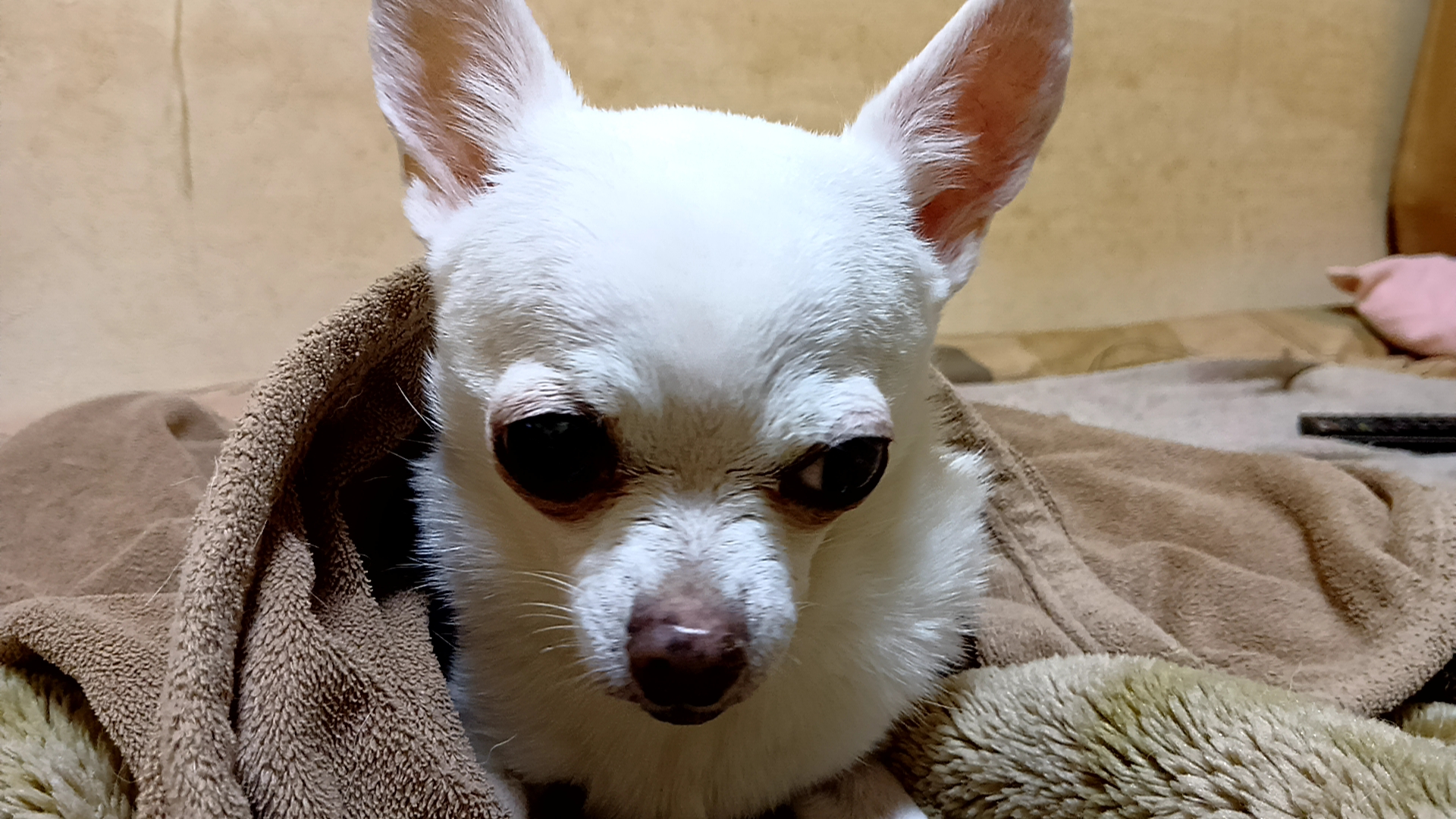 転落中には追いつけず、2階リビングに行くと、プリンスは立哨し、おしっこをチビって、泣きそうになりながらフリーズしていた。