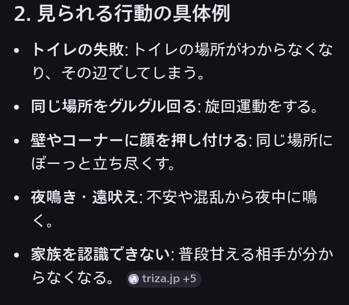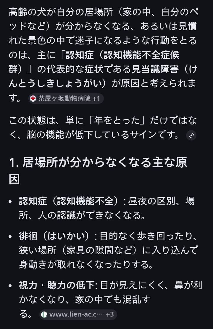 ※GoogleAIクエリ「高齢犬 自分の居場所がわからなくなる」の回答のうちトイレ(排泄)以外の症状は全て該当
