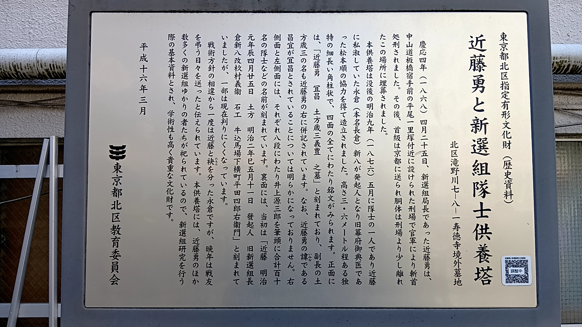 近藤勇の首は京都三条河原に曝されたが、胴体は滝野川三軒家にあった無縁塚に埋葬された。