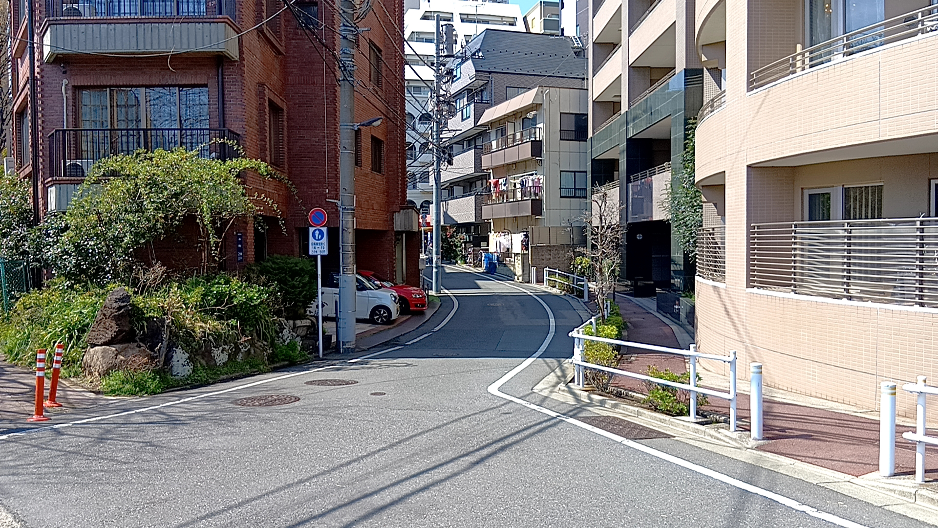 ここで急なスロープになっているのは谷端川暗渠(直進側)と千川上水暗渠(左右側)の合流地点であったことに起因する。