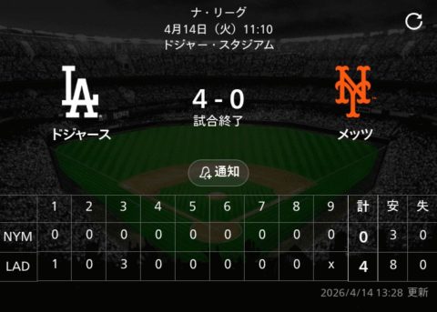 — 【MLB速報】放送地区【大谷速報】 (@MLB_comment) April 14, 2026