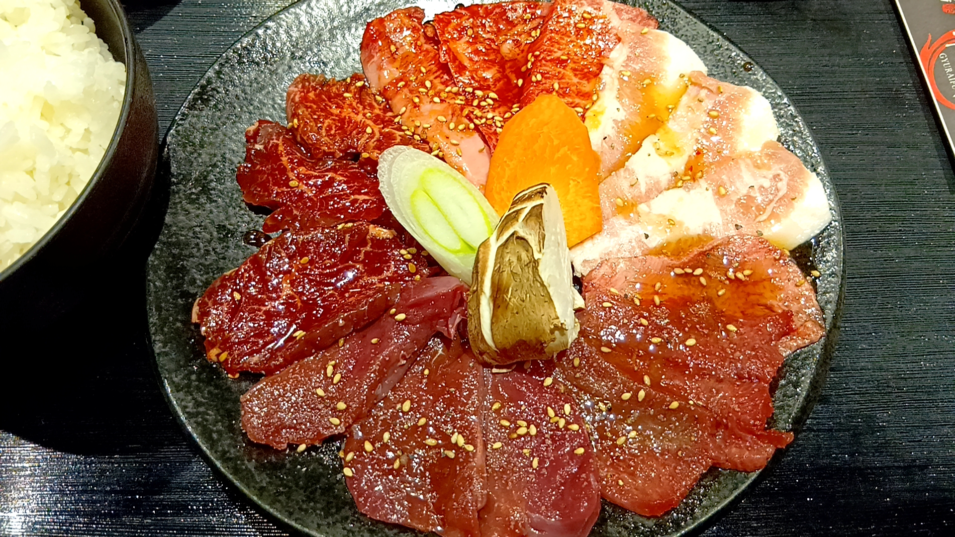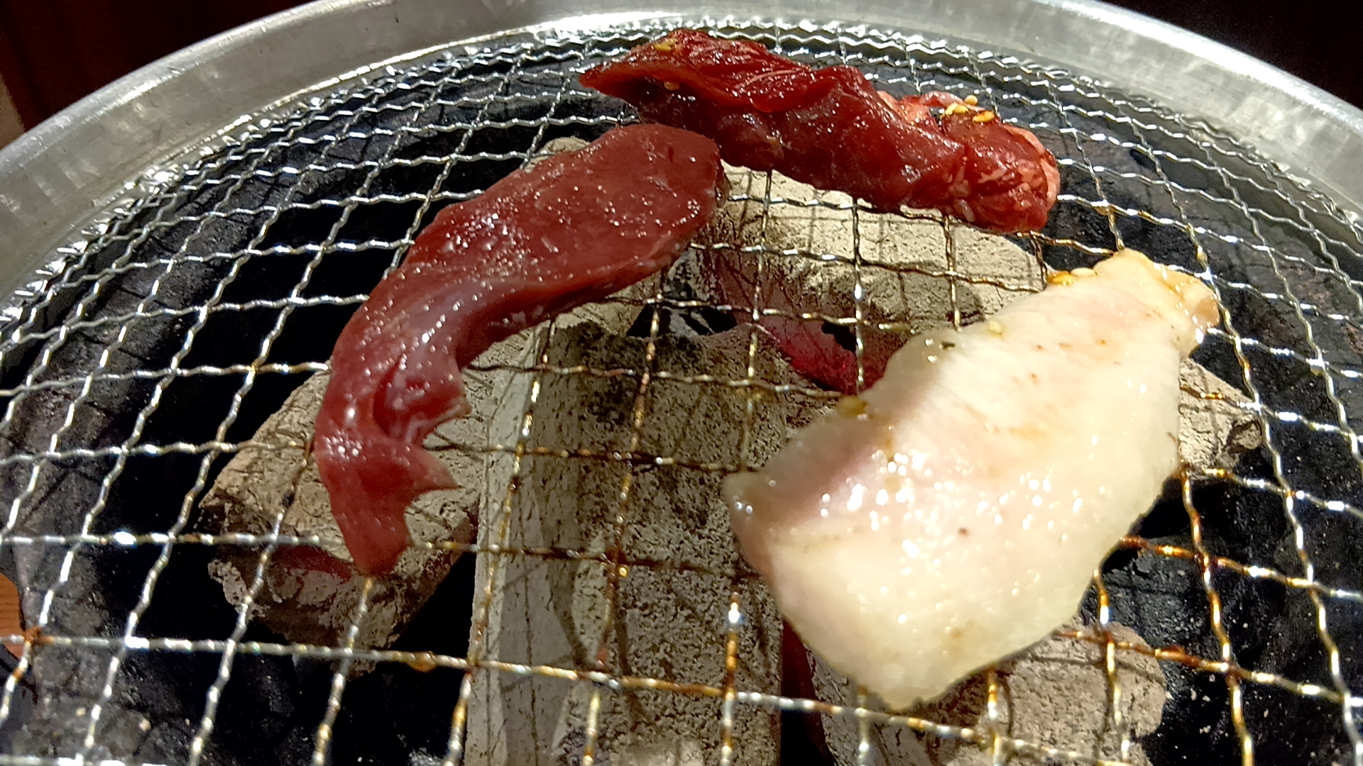 上から時計まわりに、牛カルビ・豚トロ・牛タン・牛ハツ(心臓)・牛ロース各3枚