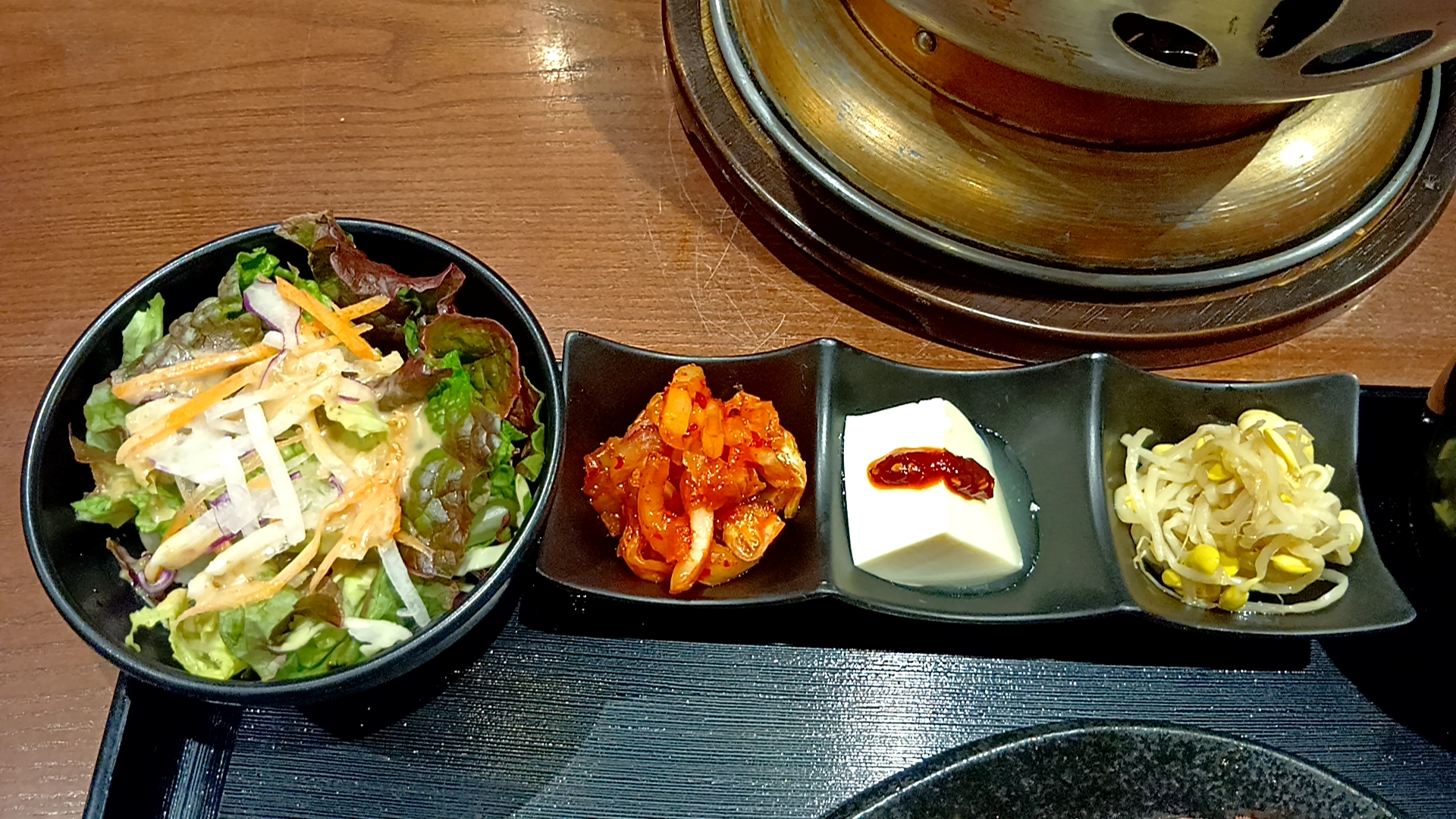 サラダと小鉢3種(キムチ・ユッケジャン豆腐・もやし)