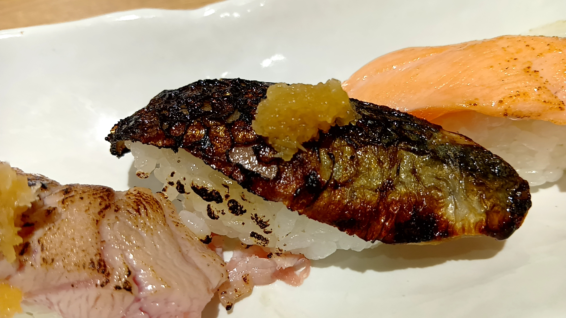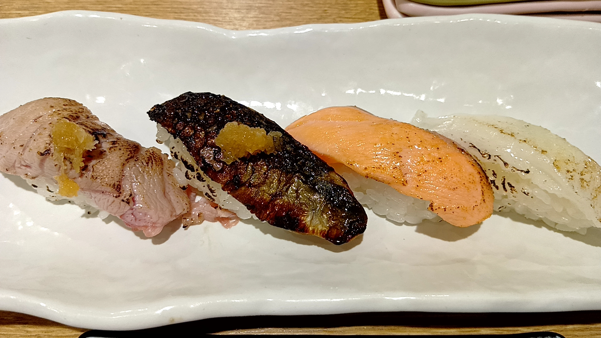 左から炙り中とろ・炙り鯖・炙りサーモン・炙りえんがわ