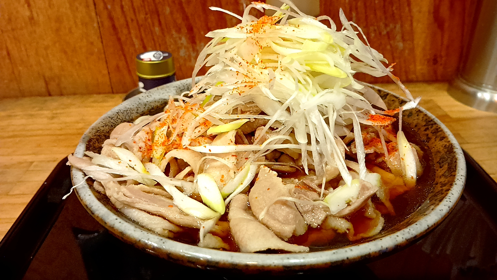 出汁の効いた夥しい豚肉の山と、一味唐辛子が効いたスープに病みつき!