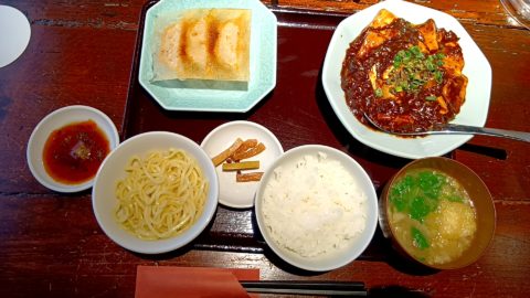 麻婆豆腐と餃子3ヶ 半麺&半ライス付き 1408円