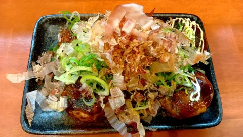 ①たこ焼き(定番ソース・九条ねぎ・一味唐辛子・青海苔・かつお節トッピング)6個 480円